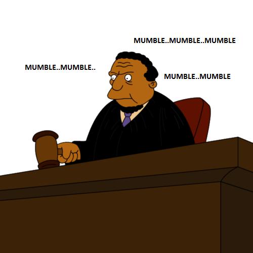 “Mumble mumble” repeated the man on high as he turned his face to the opposite side of the bench below him where a group of men in crumpled suits stood and sat. Some shuffled sheaves of papers, others looked at the floor.