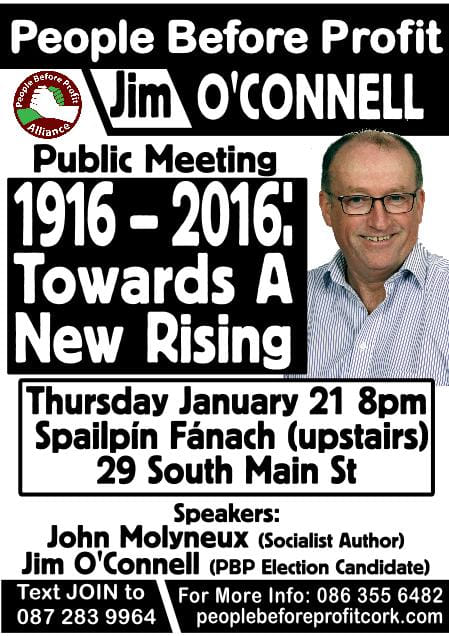 On Thursday Jan 21st socialist autthor John Molyneux and People Before Profit candidate in Cork South Central Jim O’Connell will take part in a Public Meeting to discuss “1916-2016 Towards a New Rising”.