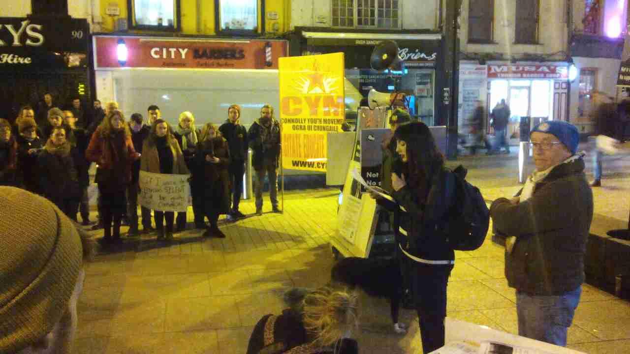 Numerous speakers addressed the crowd, including representatives of People Before Profit (Pat O’Sullivan), the Anti Austerity Alliance (Fiona Ryan), Anti Deportation Ireland (Noma Maye), women’s campaign group Right 2 Choose (Donna Rose) and the Irish Palestine Solidarity Campaign (Arthur Leahy). Musician Erika Kulnys also performed for the crowd.