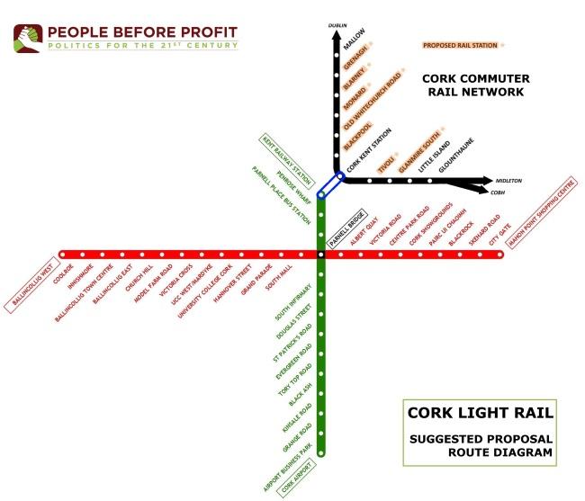 We want a serious public discussion to start about the implementation of a Light Rail system in Cork. We have offered a starting proposal of two routes which could be constructed on a mixture of on- and off-road alignments (more information, including route maps here). These routes could provide interconnectivity between residential areas, employment areas, transport hubs and the city centre. A system such as this would remove the need for many car journeys in and around Cork, and would connect the Docklands (due for redevelopment) to the city centre and Mahon. Such a solution should go hand-in-hand with expansion of commuter rail services and opening of new stations on the Cork-Cobh/Midleton lines and also on the Cork-Mallow line. We propose that new stations should be opened in Blackpool, Old Whitechurch Road, Monard, Blarney and Grenagh between Cork and Mallow, and at Tivoli and Glanmire South on the Cork – Cobh/Midleton route.